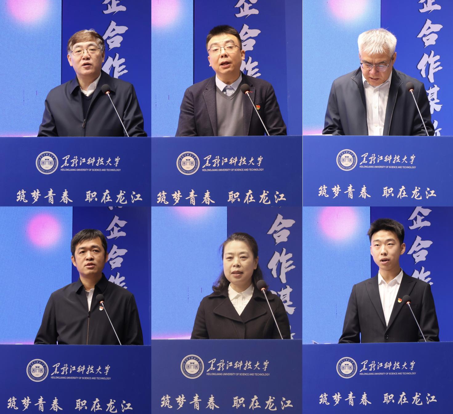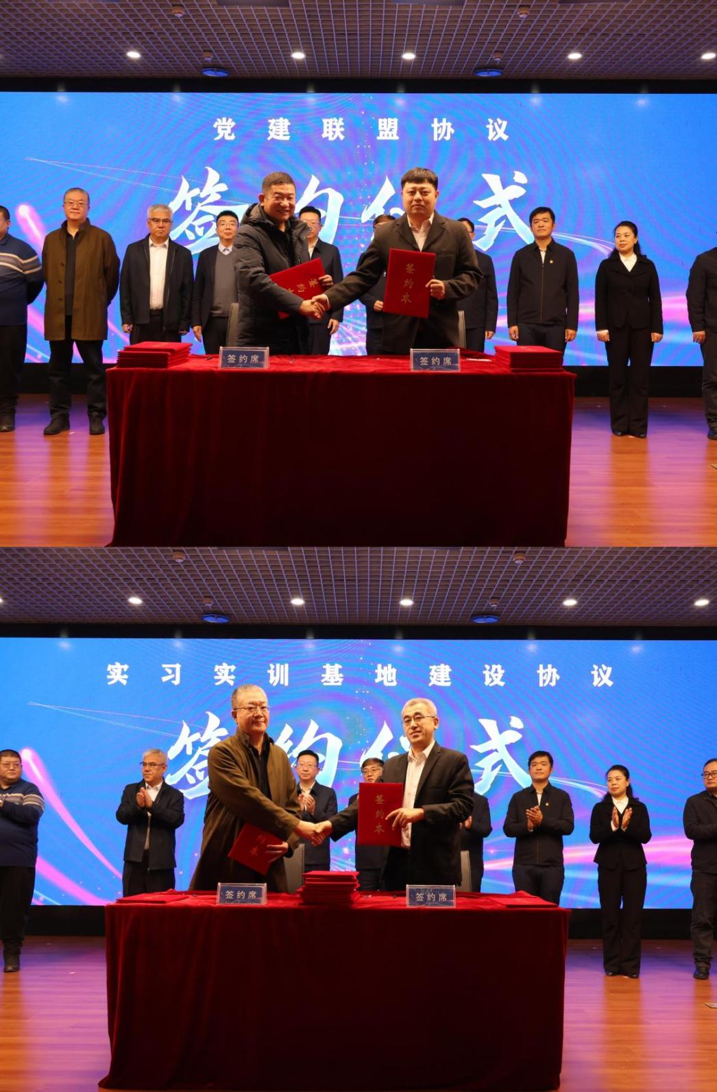 启动仪式后,建筑工程学院党委副书记展跃分别同哈尔滨工业大学建设工程项目管理有限公司副总经理于志国,哈尔滨建工集团党委委员、纪委书记谢微,江南丽景装饰工程有限公司副总经理于健签署党建联盟协议;副院长姜封国分别同哈尔滨市建设工程监理与全过程咨询行业协会会长陈永发,哈尔滨市建筑业协会会长麻中新,黑龙江省室内装饰协会会长曹宪博签署实习实训基地建设协议。