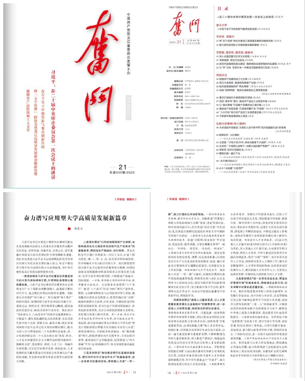 习近平总书记在黑龙江视察和在新时代推动东北全面振兴座谈会上的重要讲话重要指示精神站位高远、思想深邃,内涵丰富、语重心长,是东北地区和黑龙江振兴发展的科学指引和根本遵循,我们要坚决把习近平总书记殷殷嘱托转化为引领应用型大学高质量发展的强大动力,坚定不移沿着习近平总书记指引的方向奋勇前进,为中国式现代化龙江实践贡献智慧和力量。